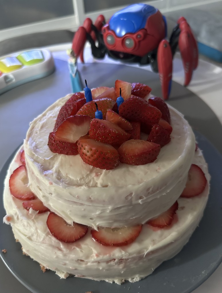 Her birthday followed a few weeks later. We kept it low-key at home, and for the first time in three years, she actually ate some of the cake I made her. She was thrilled with the Spider-Bot toy we surprised her with from Disneyland.